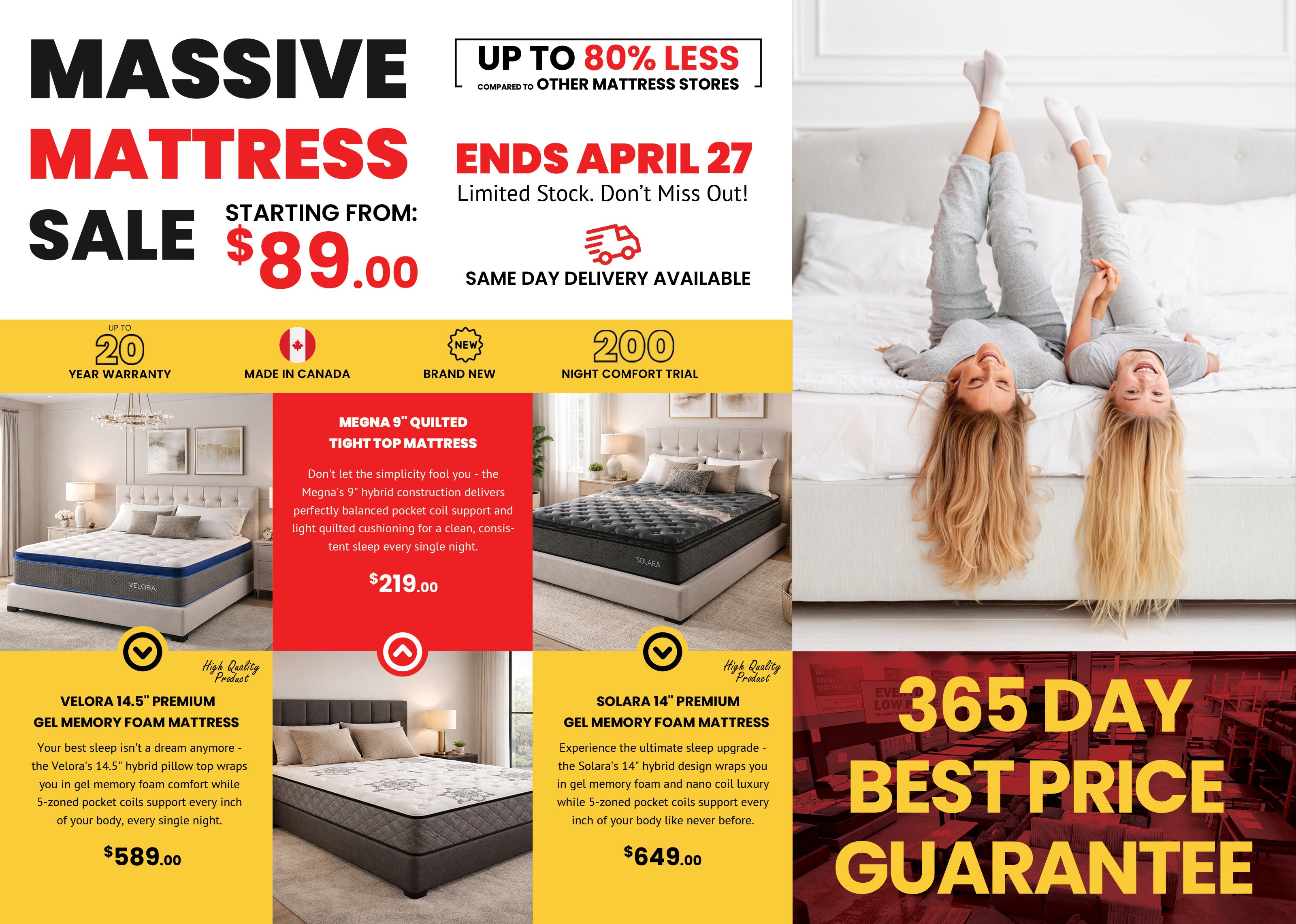 Looking for a mattress store in Halifax? Furniture Spot & Mattress Outlet carries brand-new, Canadian-made mattresses across every comfort type - foam, hybrid, pocket coil, pillow top, euro top, memory foam, and more. Shop Twin, Double, Queen, and King sizes in store and test the feel properly before you buy. Same-day pickup available and delivery across HRM and surrounding areas up to 130km.