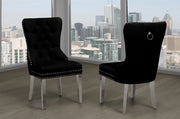 In your choice of black, cream or grey velvet fabric, chairs include chrome legs, nailhead trim, deep button tufting, and silver knocker on the back. 2 per box.